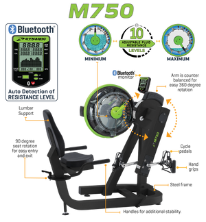 The Dynamic Fluid Exercise M750 Cycle XT UBE (Upper Body Ergometer) is a high-quality commercial grade machine that offers maximum operational versatility, including recumbent cycling and bidirectional seated or standing upper body arm cycling. The M750 is fitted with a dual functioning pedal cage with foot straps and ergonomically designed handles for upper body use.