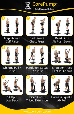 The CorePump® machine is a revolutionary resistance training device that combines functional strength training and high intensity interval exercise. The CorePump® machine minimizes the space required for gym equipment with a design engineered to take up very little floor space. If you can find 4 square feet of space in a room, the CorePump® machine can provide you with infinite exercise possibilities. There are more than 66 possible handle positions for the CorePump® machine's patented adjustable handles. Those 66 handle positions are designed for use with our 20 basic exercises and stretches. Need to get a workout in without making a lot of noise? The CorePump® machine is whisper quiet because it does not use weights or require electricity. It is also extremely easy to put together.