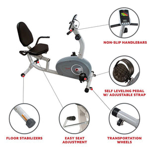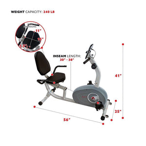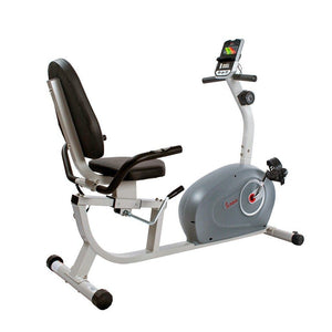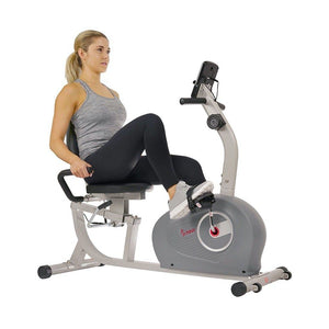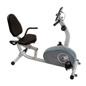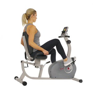 Achieve a hassle-free cardiovascular workout with the Sunny Health & Fitness SF-RB4905 Magnetic Recumbent Exercise Bike. Easily mount and dismount the stationary bike with the step-through design with minimal leg movement. The wide, adjustable exercise seat has lumbar support that can help you work out comfortably for longer durations. Move the adjustable seat with the easy-to-use lever to accommodate leg inseams between 30" Min - 38" Max inches. Keep your feet secure with the universal foot strap when you pedal. Maintain stability on the home use cardio machine with the built-in levelers. Grab on to the padded handlebars to secure balance and positioning throughout your exercise. Easily track your heart rate when you hold the pulse sensors.