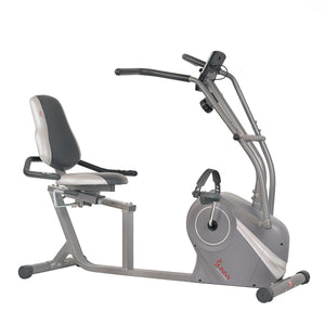 Achieve a hassle-free cardiovascular workout with the Magnetic Recumbent Exercise Bike model number SF-RB4936 by Sunny Health & Fitness. Easily mount and dismount the stationary bike with the step-through design with minimal leg movement. The wide, adjustable exercise seat has lumbar support that can help you work out comfortably for longer duration. 8 levels of magnetic resistance for challenging workout sessions. Move the adjustable seat with the easy-to-use lever to accommodate leg inseams between 24 in Min - 32 in Max inches. Maintain stability on the home use cardio machine with the built-in levelers. Grab onto the full motion arms to work out your arms and upper body. Easily track your heart rate when you hold the pulse sensors.