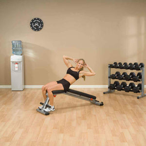 The Body-Solid GFID225 Multi-Bench is the perfect training partner - functional, compact, portable and durable. It requires no assembly and is designed to be used straight out of the box. Features include seven adjustment positions for flexibility and comfort. The 2” x 4” oval tubing ensures durability and support for the heaviest of workouts. Built-in wheels make transport quick and easy and it folds flat for storage under a bed or on end in a closet. In-Home Lifetime Warranty. This adjustable bench is perfect for compact environments!