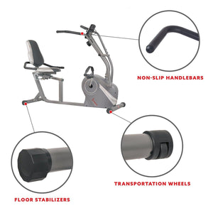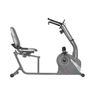 Achieve a hassle-free cardiovascular workout with the Magnetic Recumbent Exercise Bike model number SF-RB4936 by Sunny Health & Fitness. Easily mount and dismount the stationary bike with the step-through design with minimal leg movement. The wide, adjustable exercise seat has lumbar support that can help you work out comfortably for longer duration. 8 levels of magnetic resistance for challenging workout sessions. Move the adjustable seat with the easy-to-use lever to accommodate leg inseams between 24 in Min - 32 in Max inches. Maintain stability on the home use cardio machine with the built-in levelers. Grab onto the full motion arms to work out your arms and upper body. Easily track your heart rate when you hold the pulse sensors.