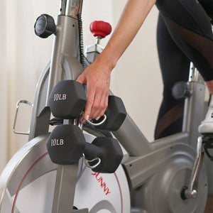 DUMBBELL HOLDERUse this cycling exercise bike in tandem with dumbbells (not included) to engage muscles in your upper body and core while you cycle. You can store them onto the built-in dumbbell holders when they are not in use (up to 20lb). |