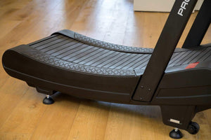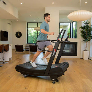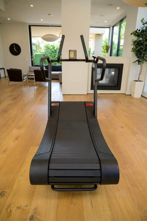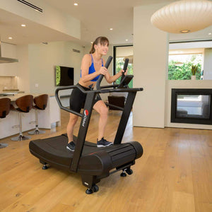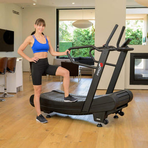 Unlike standard electric treadmills, the Pro6 Arcadia Air Runner features an innovative curved deck that is completely controlled by the movements and force of the athlete using it. The simple design of this unique, non-motorized treadmill is also what makes it one of the most effective devices for high speed and interval training. There are no on/off switches or complex buttons and settings to worry about. It's a manually operated treadmill that helps train and promotes technically-sound running posture, balance, and cadence.
