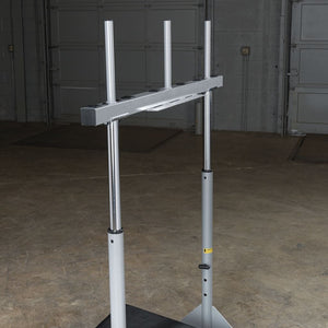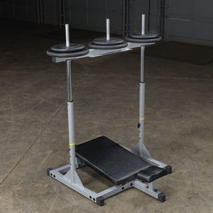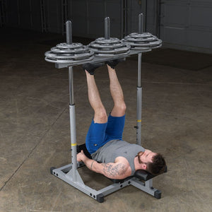 The Powerline Vertical Leg Press provides an impressive platform for obtaining huge muscle gains through isolated lower body workouts. The unique vertical design not only reinforces support for your back and hips, but also minimizes space used to perform the exercises. Extra-thick back pad and contoured head and neck pad lock you into the proper exercise position while providing comfort during your leg press or calf raise routines. Features include dual adjustable 1/2" steel locking pins, three different starting and stopping positions and a diamond plate steel press deck for no-slip control. Three 1" standard plate posts allow increased resistance for a progressive challenge every time you work out. The PVLP156X is crafted of durable alloy steel with an extremely tough powder coat finish. 400 lb. weight capacity.